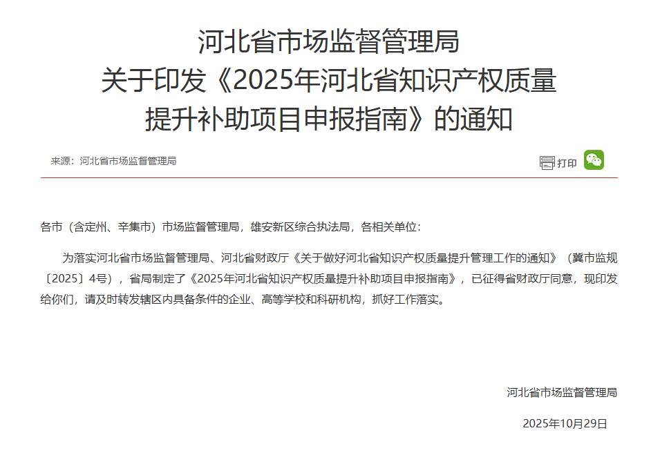 河北省市场监督管理局 关于印发《2025年河北省知识产权质量 提升补助项目申报指南》的通知